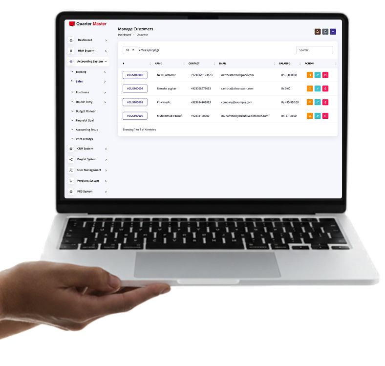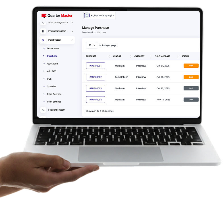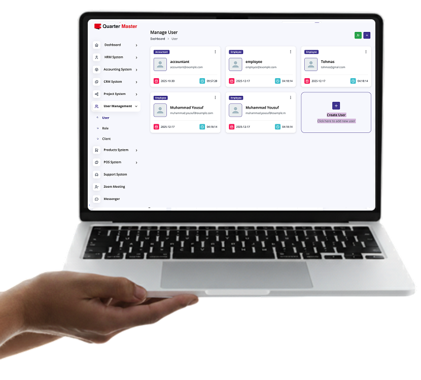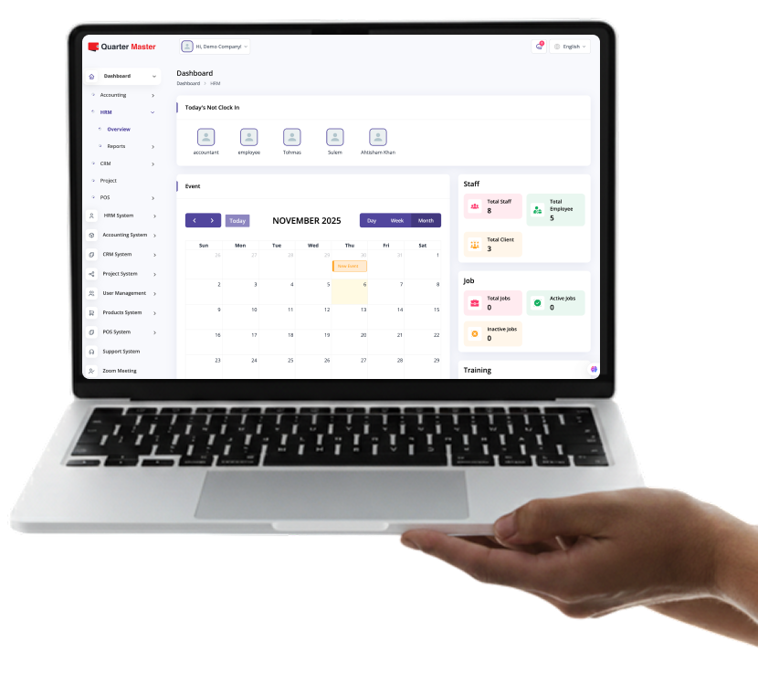 The Quarter Master is an all-in-one business management software that helps you manage accounting, HR, sales, inventory, and operations from one smart platform.